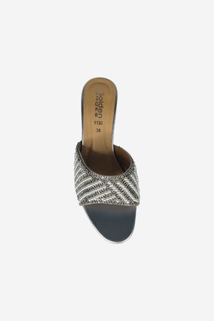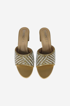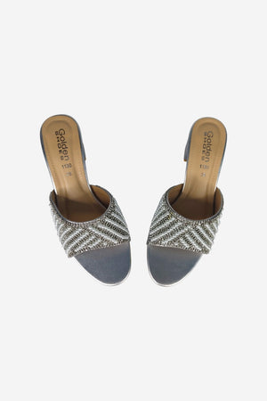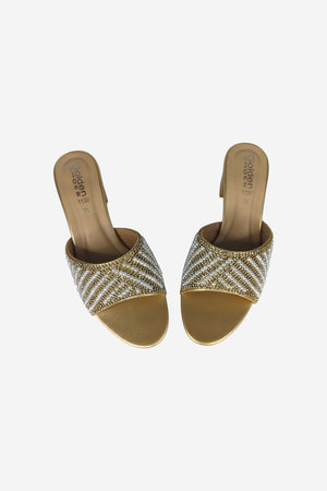• Material: Metallic synthetic upper material. Features a stable low block heel and a strap meticulously covered in high-quality faux pearls and beads.