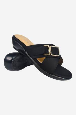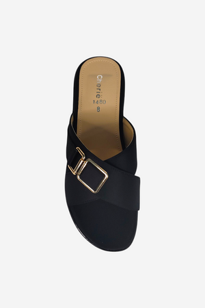 Look: An elegant, open-toe slide set on a subtle low wedge heel. The wide straps criss-cross over the foot, adorned with a substantial gold-tone rectangular buckle, perfect for a comfortable yet polished everyday style.