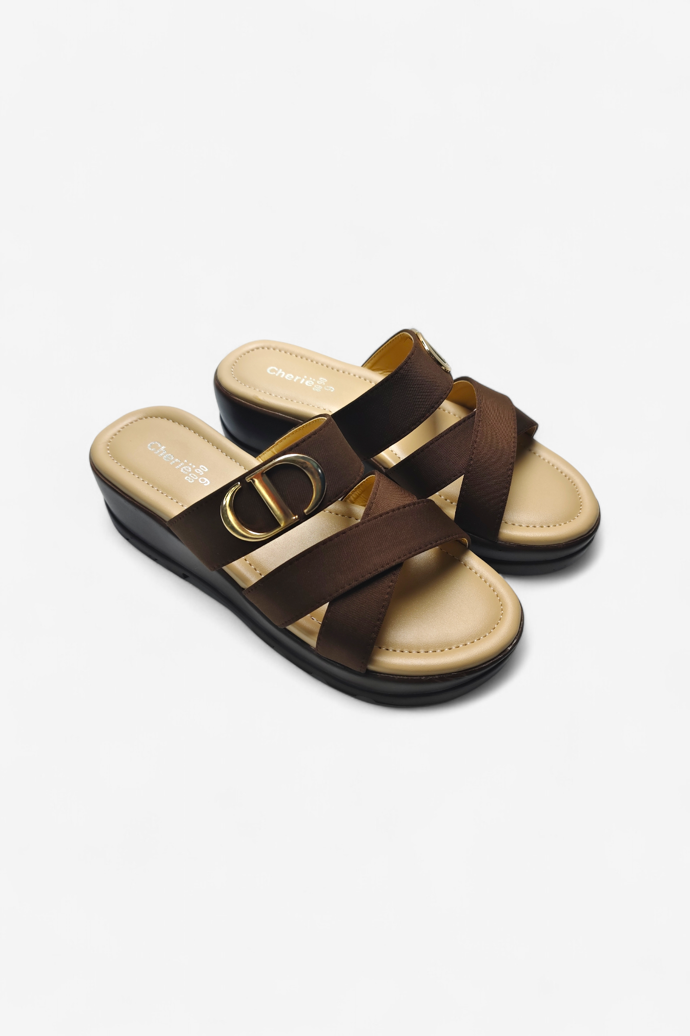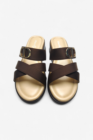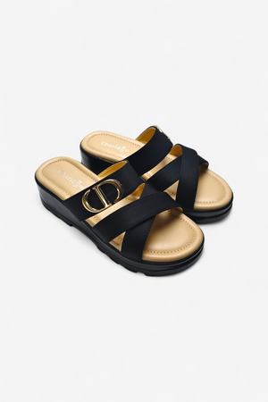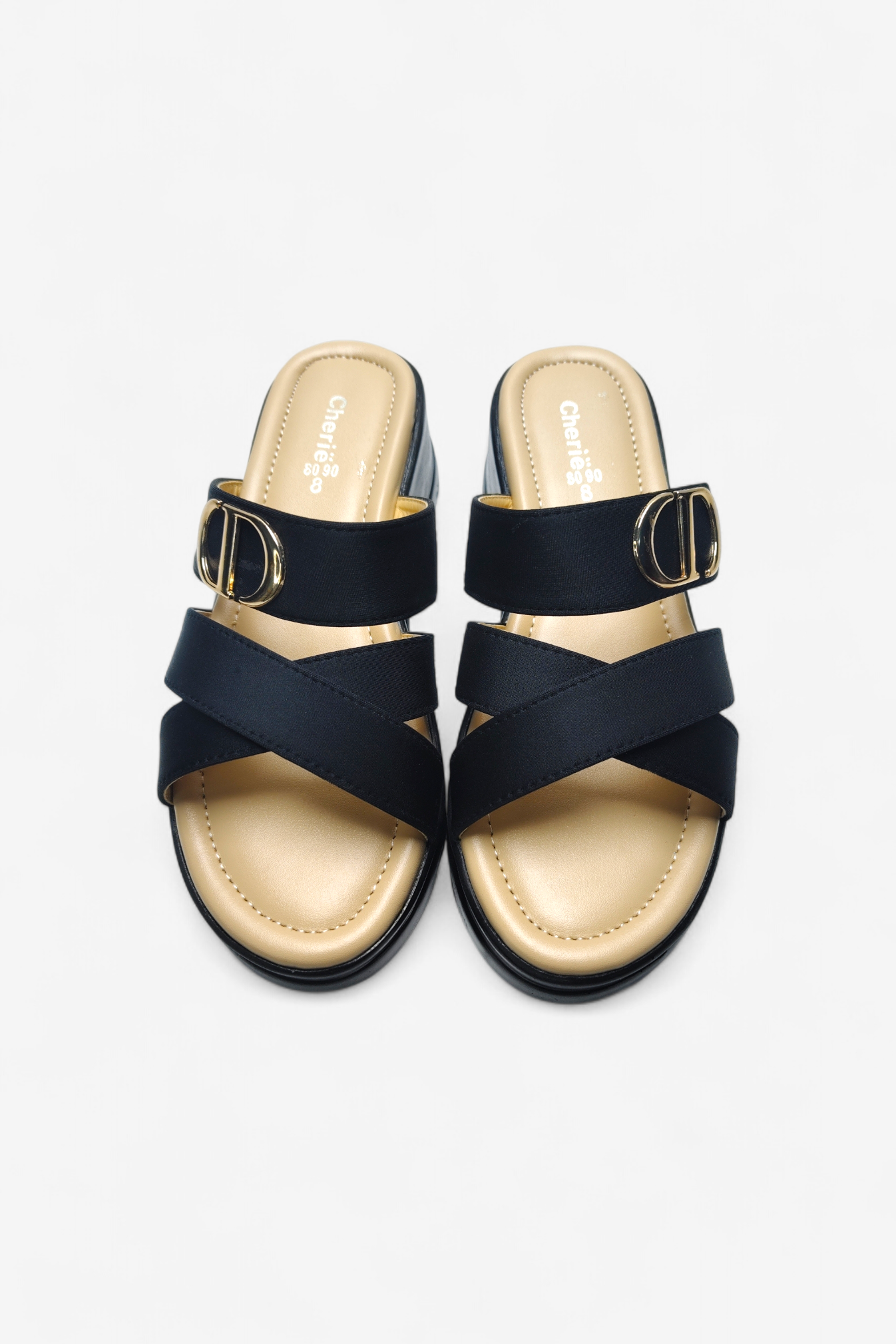 Look: Casual wedge slide; wide criss-cross straps; bold gold monogram buckle.