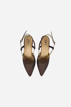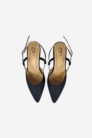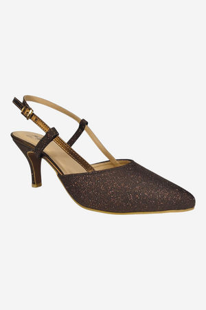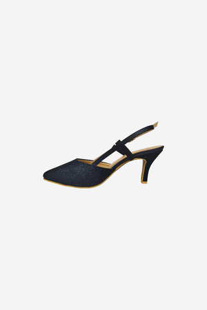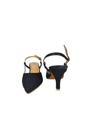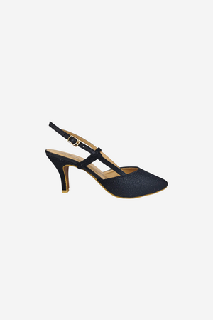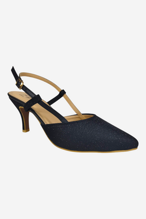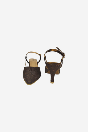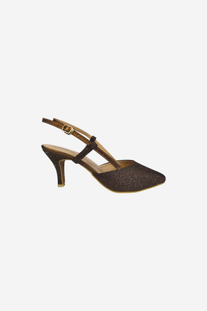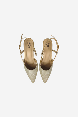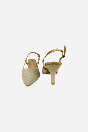 A modern interpretation of a vintage-inspired silhouette. This pump features a sharp, pointed-toe, crafted from a luminous, finely-textured shimmer textile in a pale gold hue. The design is distinguished by its elegant T-strap and secure, adjustable slingback, both rendered in a contrasting metallic gold. Balanced on a sleek kitten heel, this is the definitive shoe for adding graceful, polished glamour to formal or celebratory ensembles.