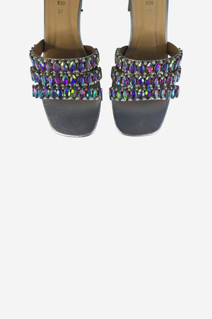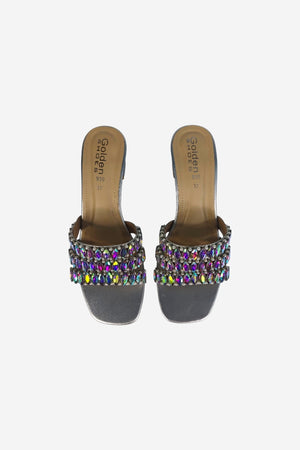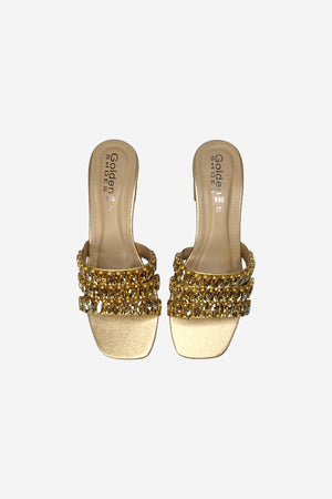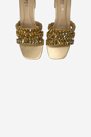 A striking statement of modern glamour. This mule is defined by its contemporary square-toe silhouette and a stable, walkable block heel, all crafted in a luminous metallic gold finish. The design is distinguished by three parallel straps, each lavishly adorned with a mix of large, faceted crystals and subtle pearl accents. This is the definitive shoe for elevating evening attire or adding an opulent touch to celebratory events.