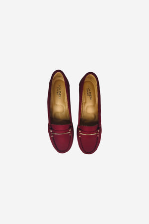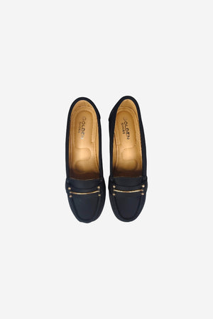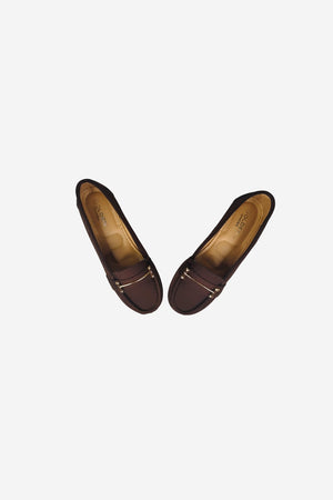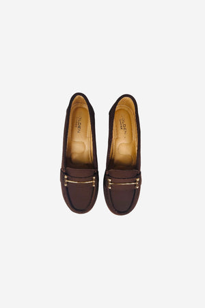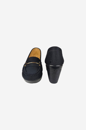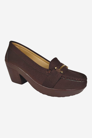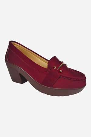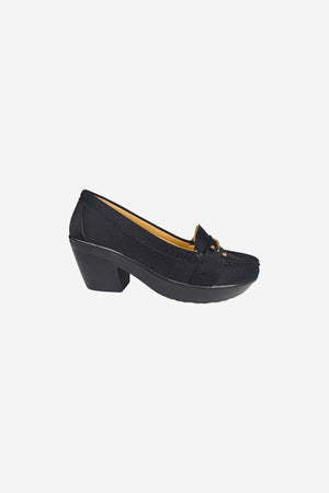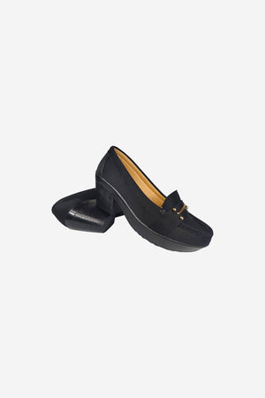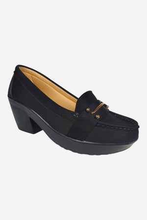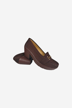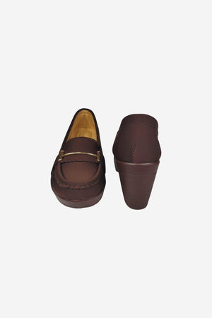 This shoe masterfully reinterprets the classic loafer with a confident, architectural block heel and an integrated platform for stable, all-day elevation. Crafted from a durable, sophisticated textile, its timeless silhouette is updated with a sleek, minimalist metallic bar for a touch of modern polish. It is the essential shoe for the woman who commands her day with assured, understated style.