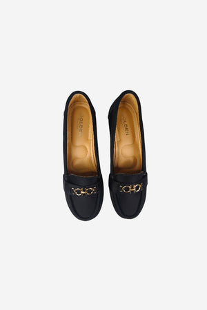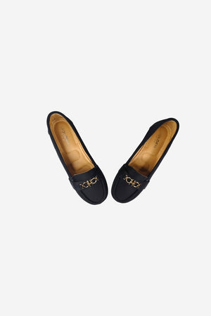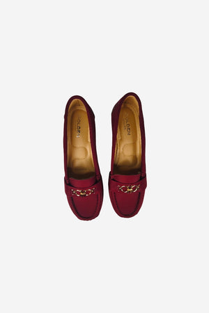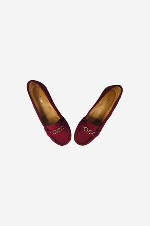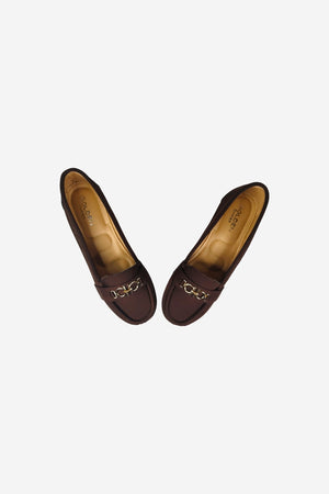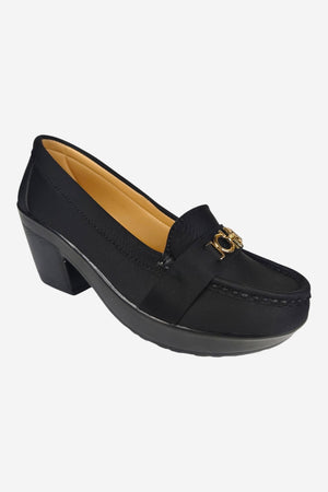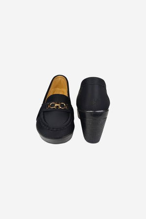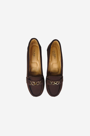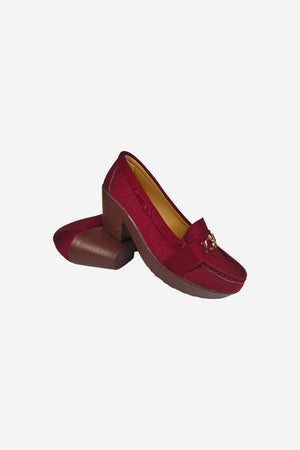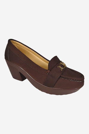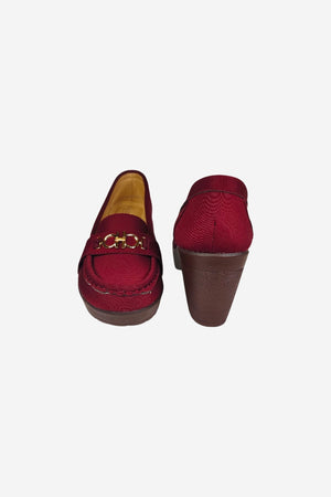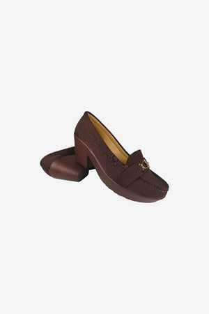 A confident fusion of classic design and modern elevation. This heeled loafer is crafted from a durable, textured fabric in a rich espresso brown/black/maroon color. The design is defined by its substantial block heel and integrated platform, offering both stability and statement height.