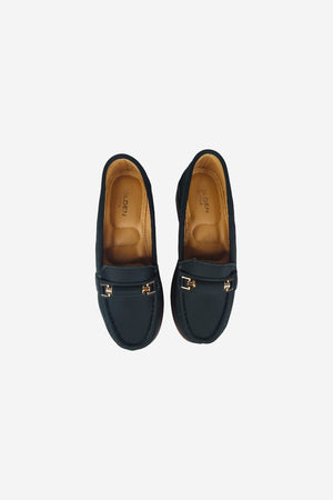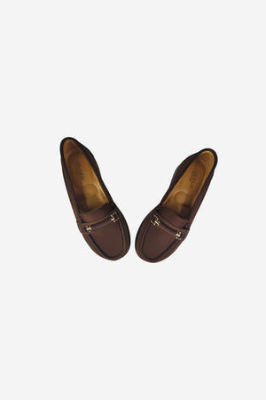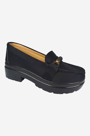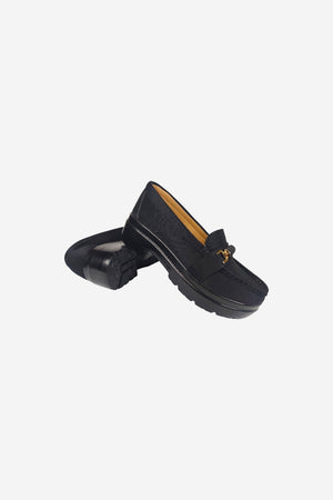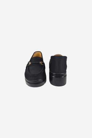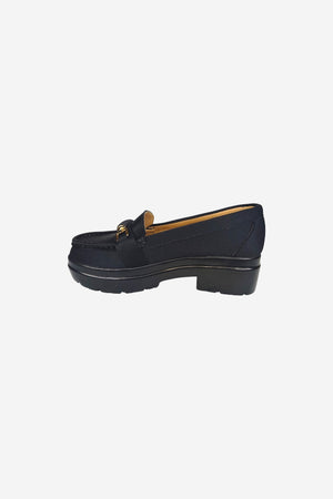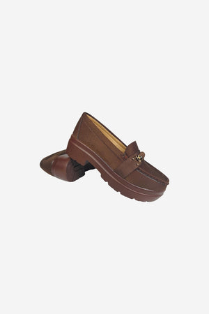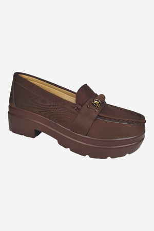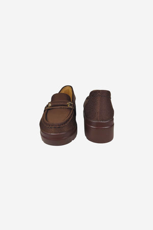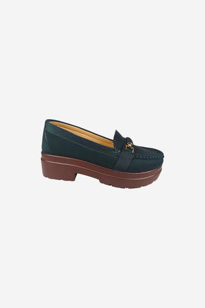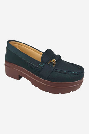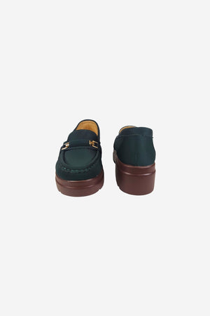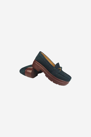 A bold reinterpretation of the classic academic loafer. This design confidently merges a timeless silhouette with a contemporary, elevated stance. Crafted from a deep, forest-green textured fabric, it features a classic moc-toe highlighted by tonal contrast stitching. The focal point is the substantial, chocolate-brown lug platform sole, offering statement height. A refined, miniature gold-tone bit on the saddle strap adds a final touch of polished hardware. This is the definitive shoe for adding a fashion-forward edge to curated ensembles.