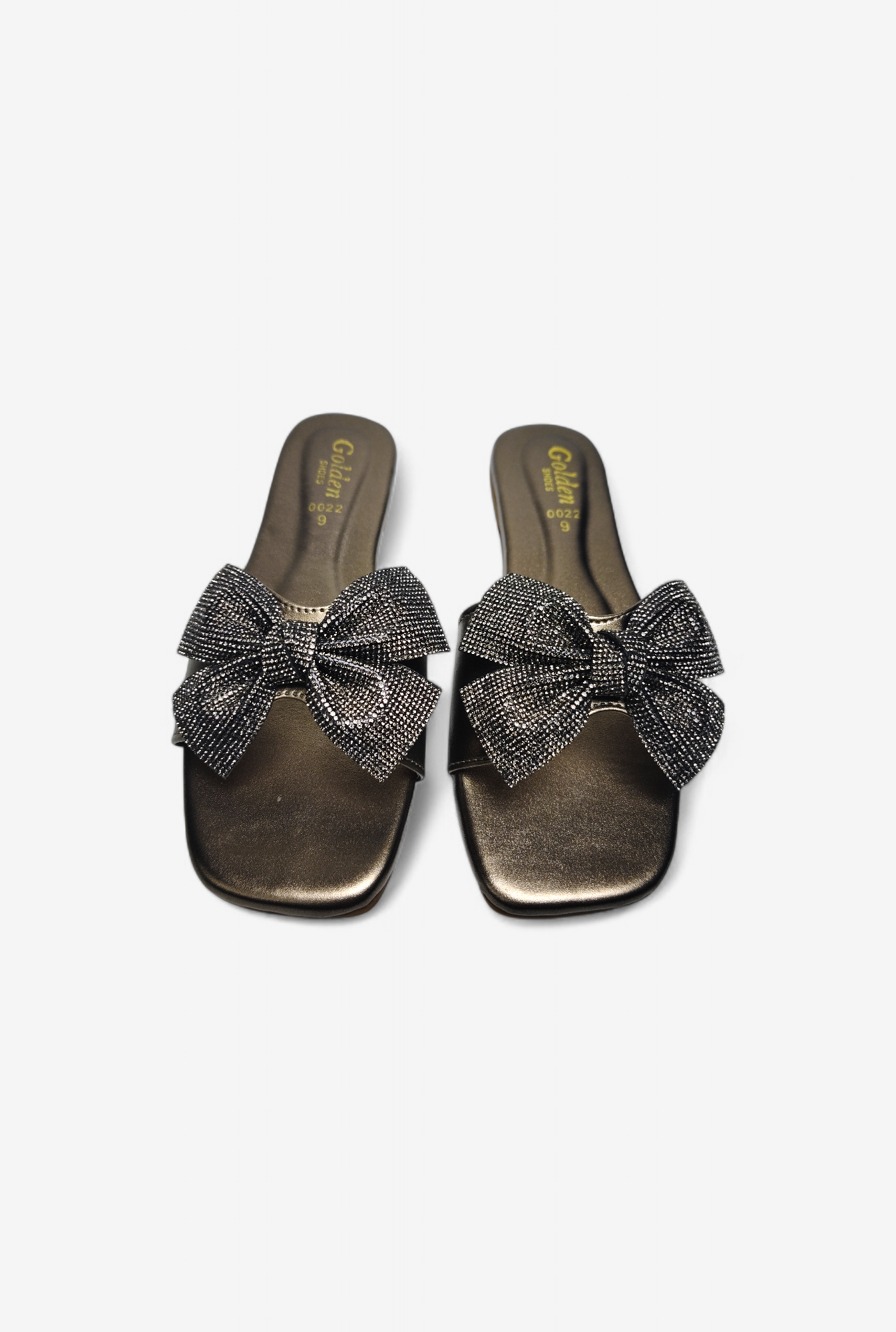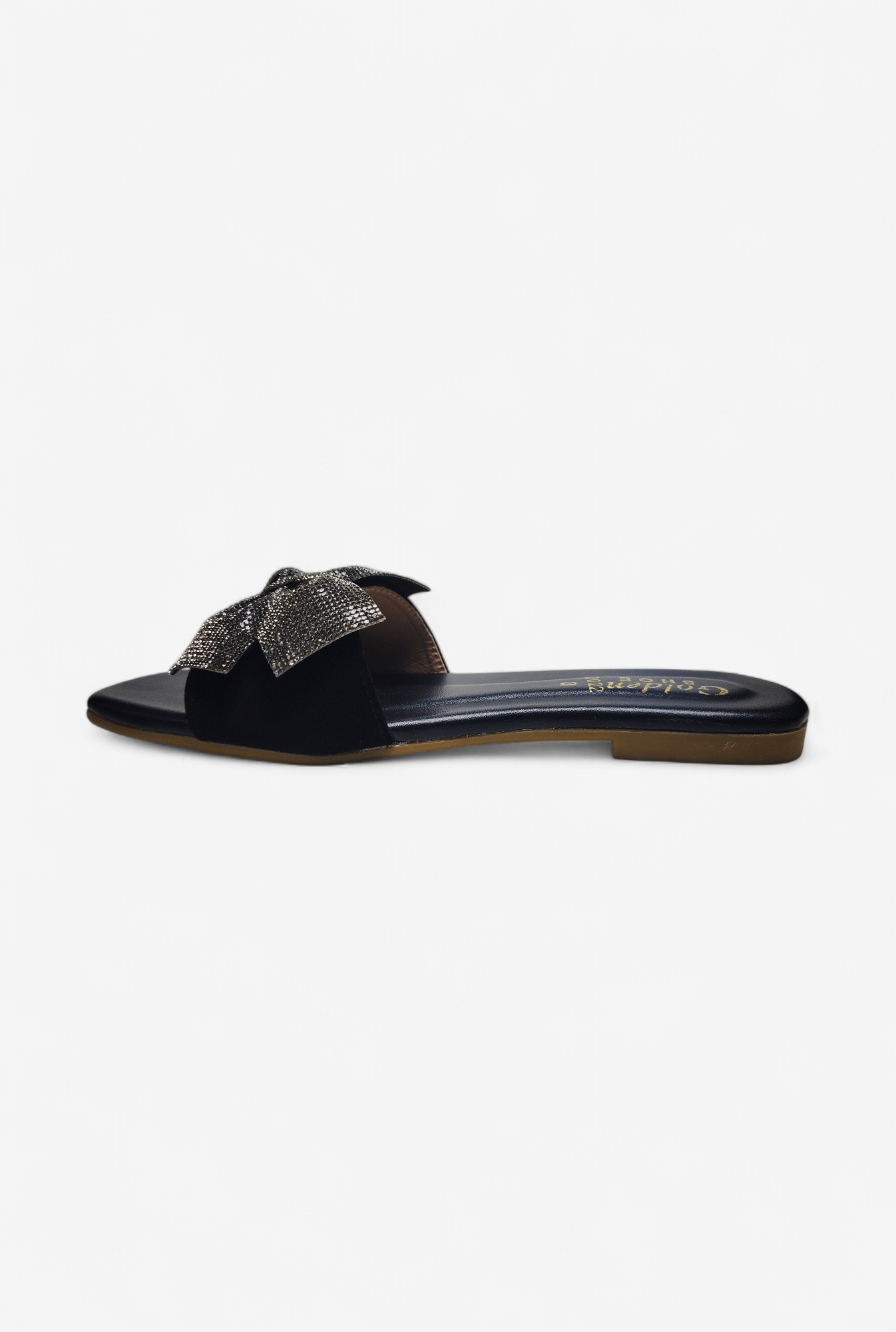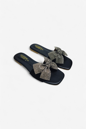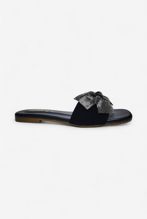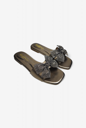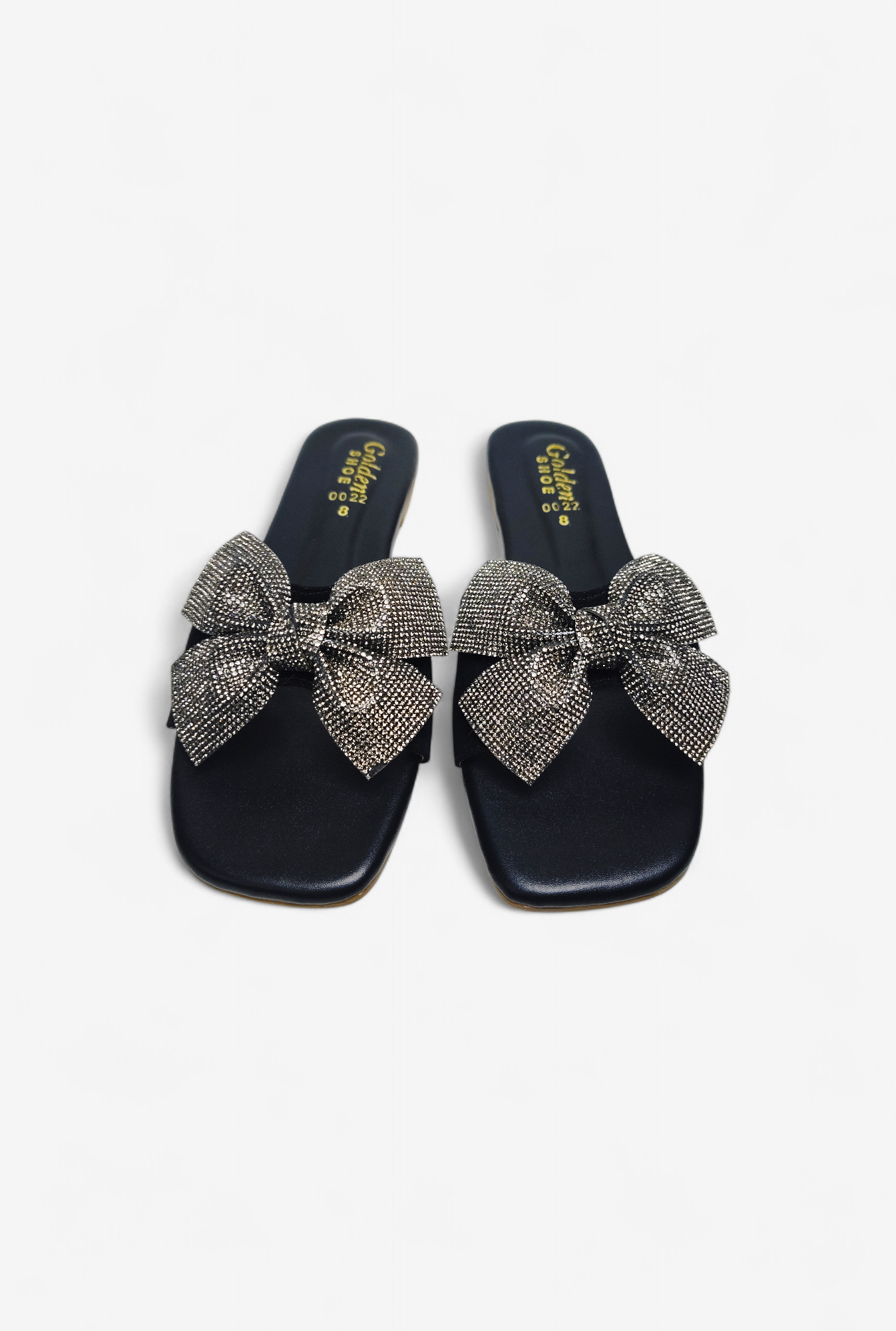 • Look: An elegant, open-toe flat slide with a modern square toe. The statement piece is the large, knotted bow, entirely covered in shimmering gunmetal rhinestones for a bold yet sophisticated sparkle.