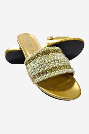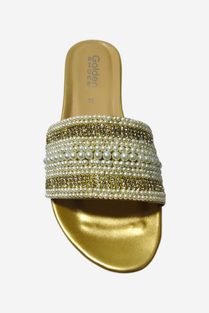 • Look: A highly luxurious and elegant open-toe flat slide. The wide strap is completely covered in alternating rows of luminous white pearls and sparkling gold beads/crystals, offering a rich, flat, and opulent look.