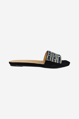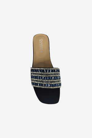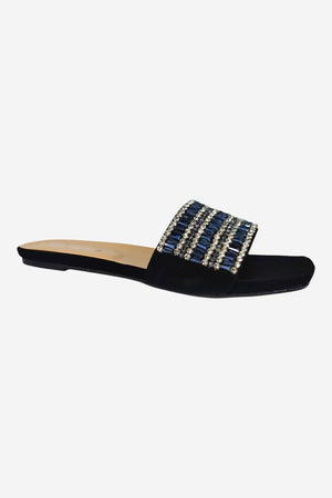 Look: A modern, open-toe flat slide with a subtle square toe. The wide strap is intricately decorated with striking blue and silver rhinestones, creating a vibrant, luxurious sparkle perfect for elevated casual wear.
