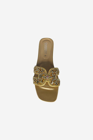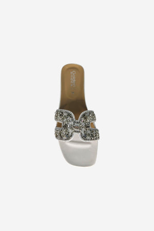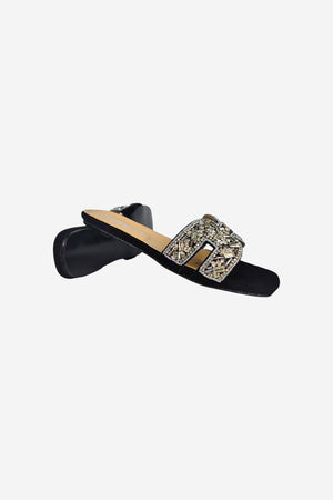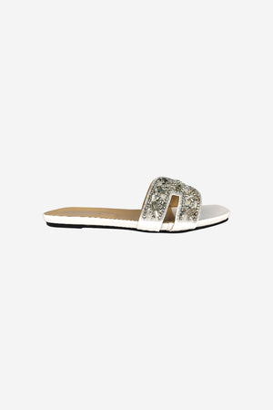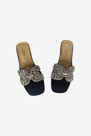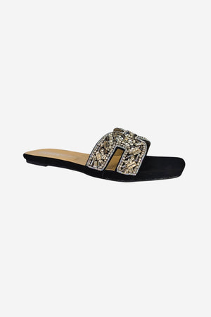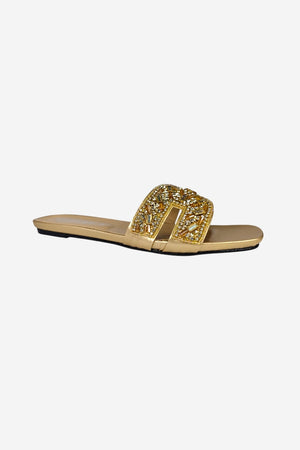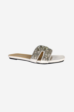 • Look: An elegant, open-toe flat slide with a modern square toe. The wide strap features a stunning, intricate crystal and rhinestone embellishment in an arch pattern, perfect for light summer glamour.