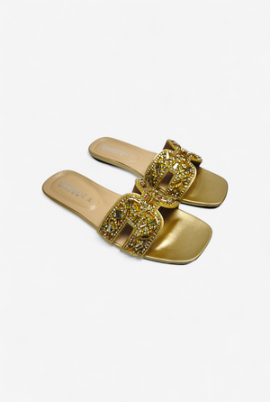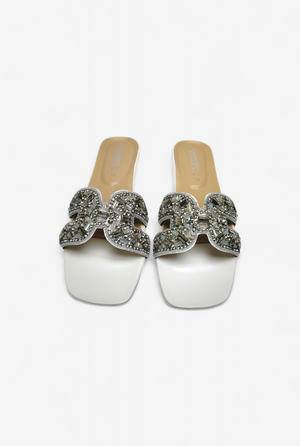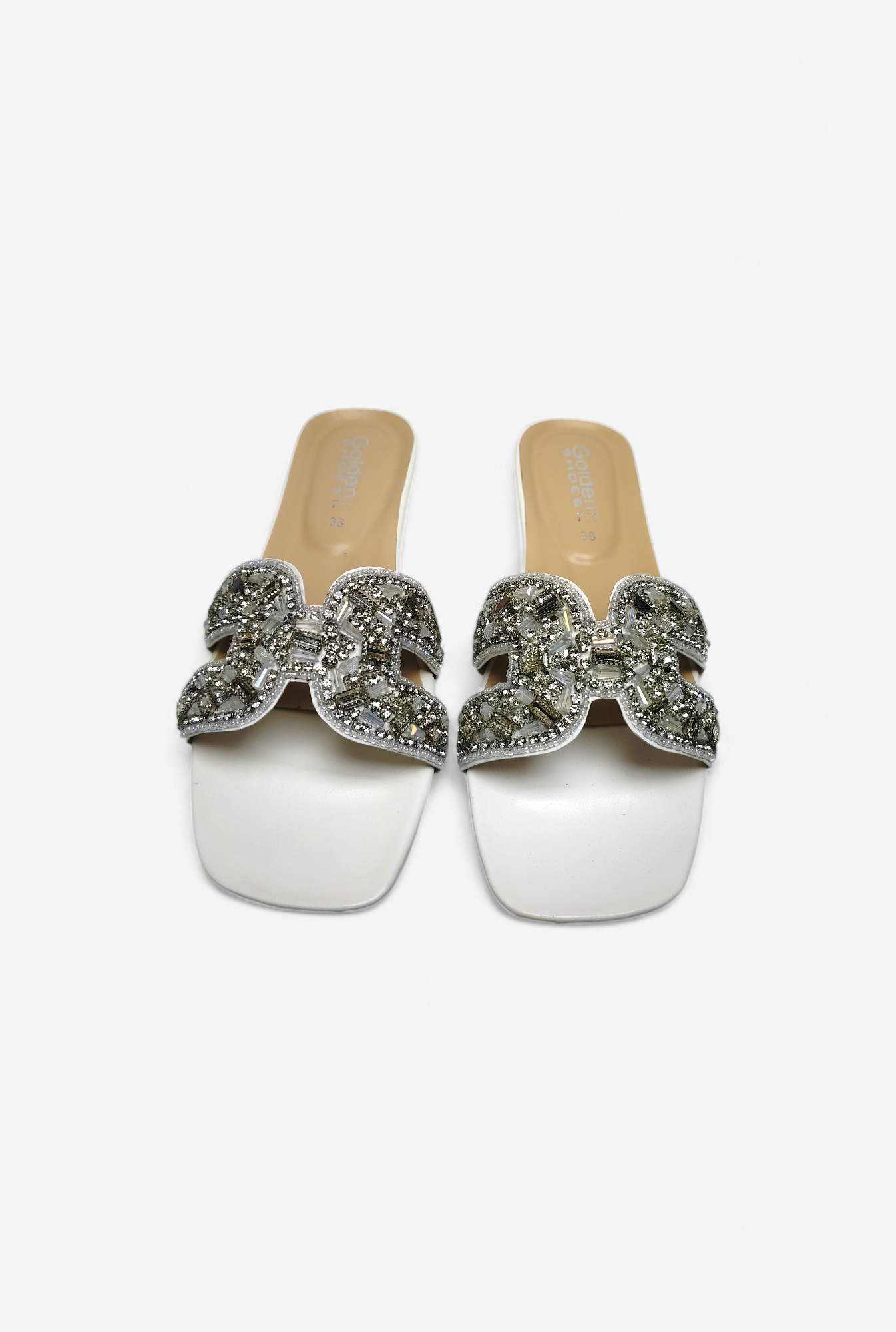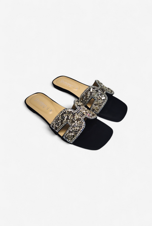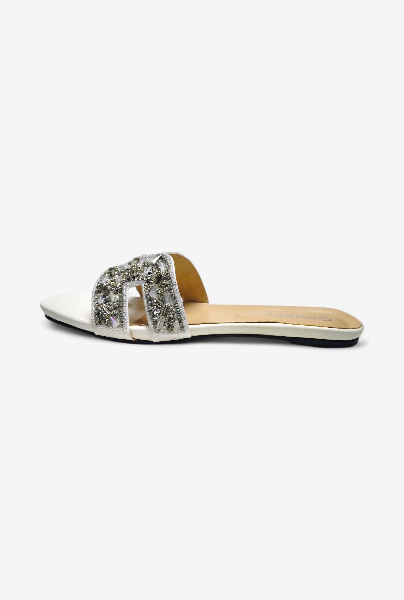 • Look: An elegant, open-toe flat slide with a modern square toe. The wide strap features a stunning, intricate crystal and rhinestone embellishment in an arch pattern, perfect for light summer glamour.