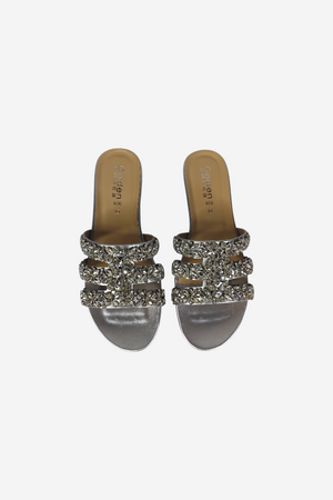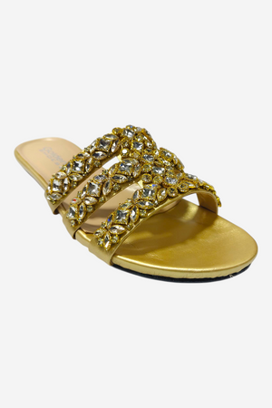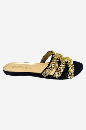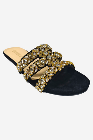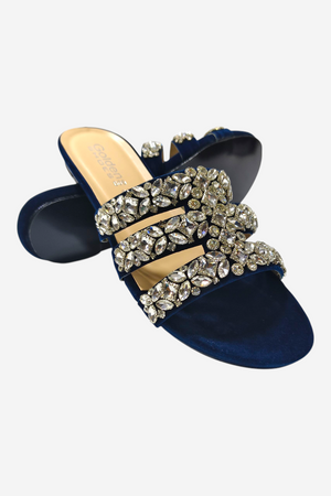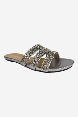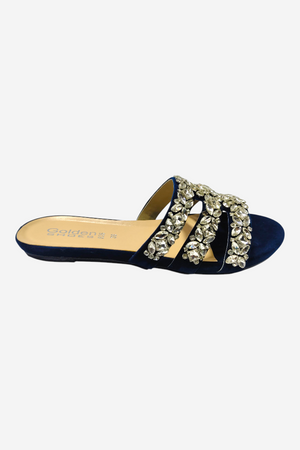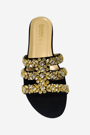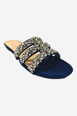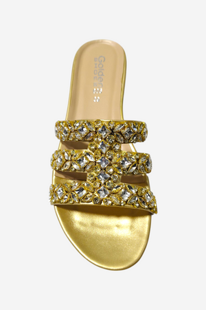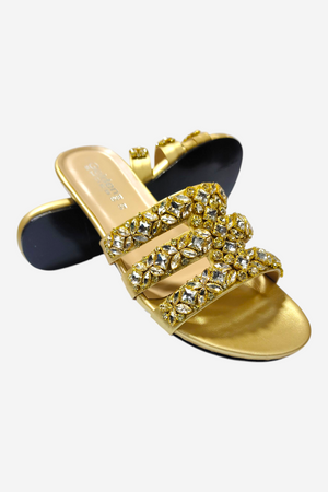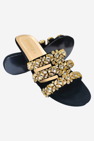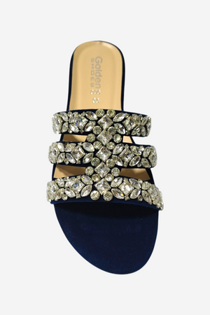 Look: A highly glamorous, open-toe flat slide. Features three wide, densely embellished straps covered in large, marquise-cut crystals, creating a rich, luxurious statement.