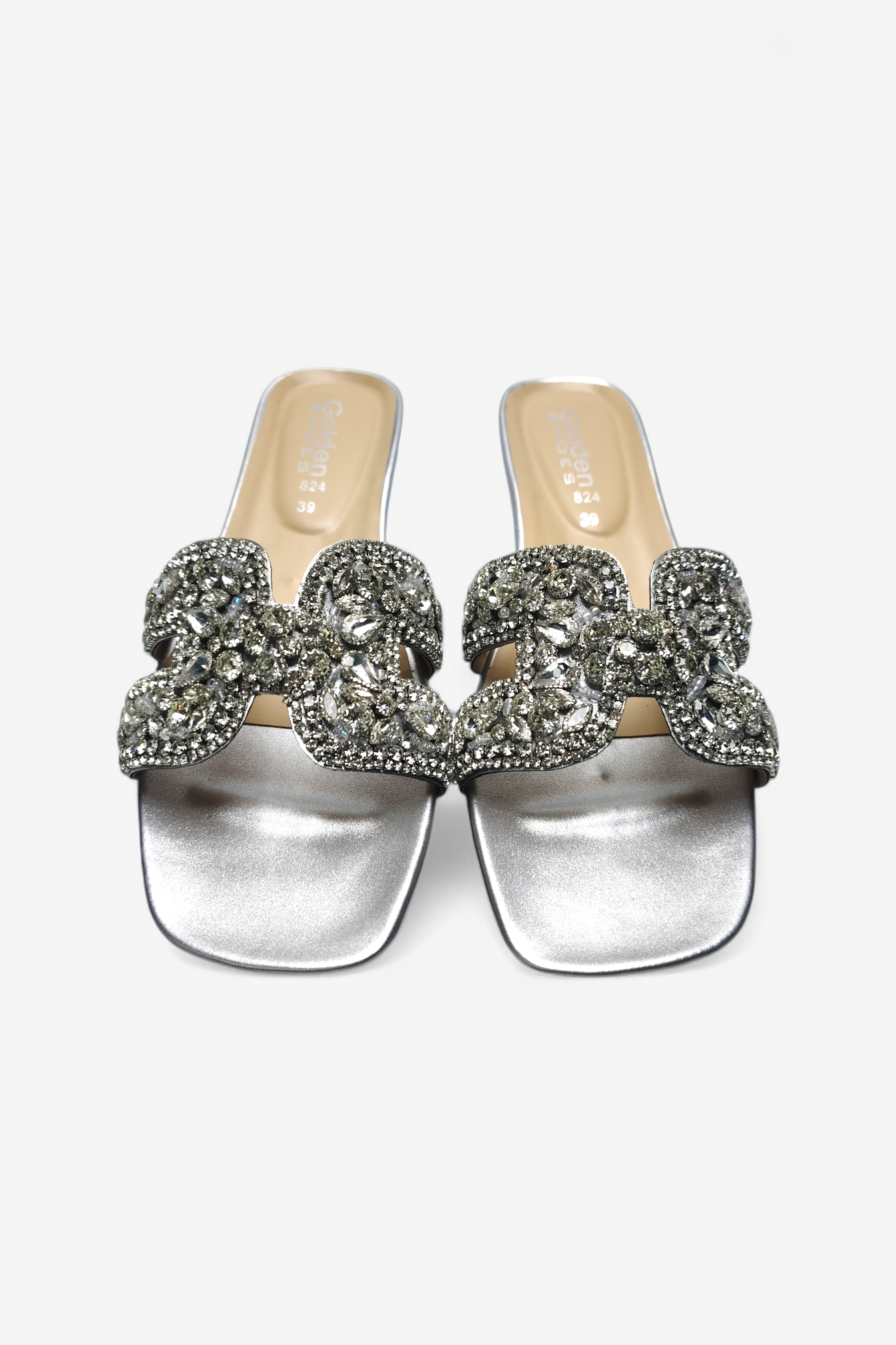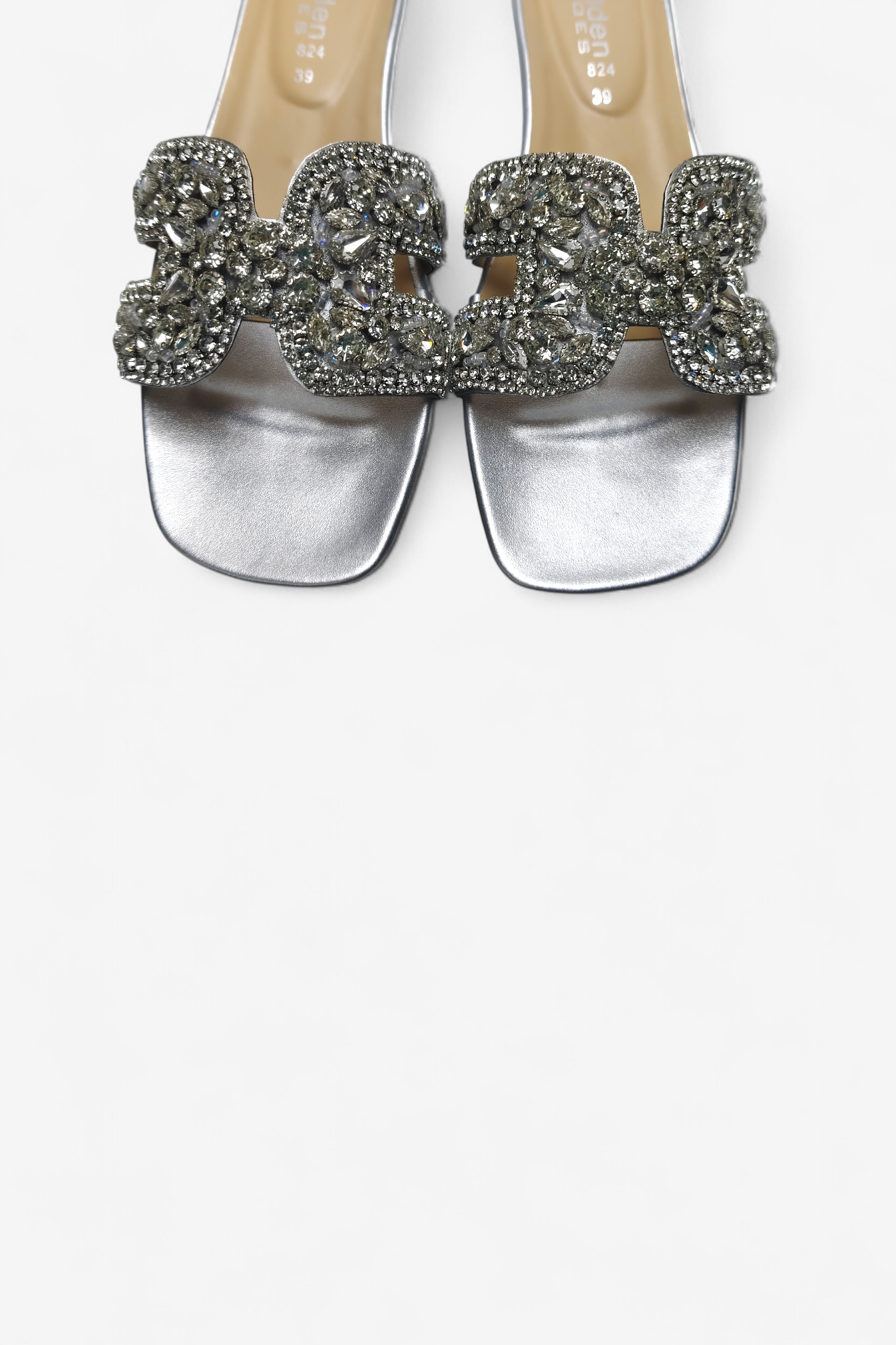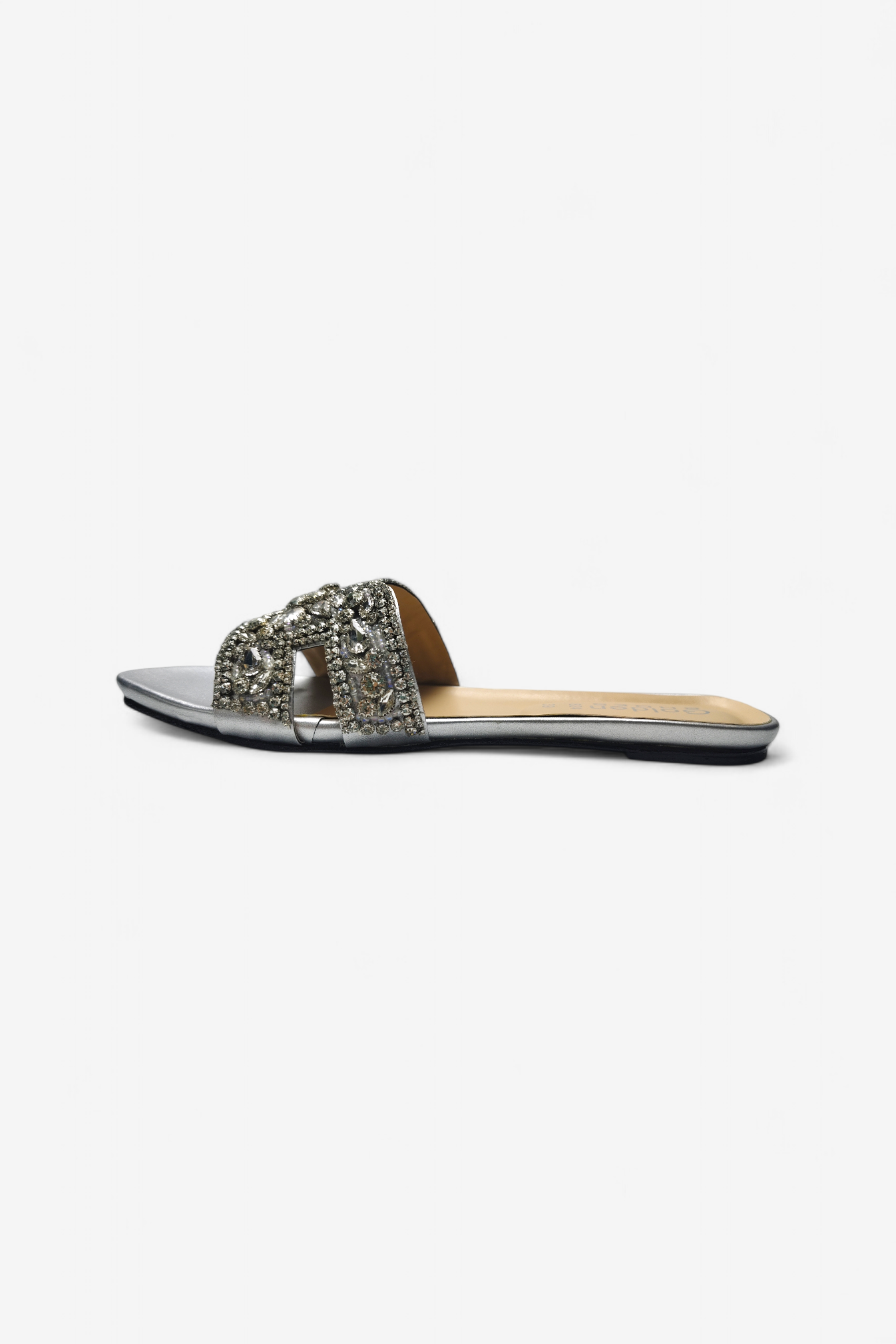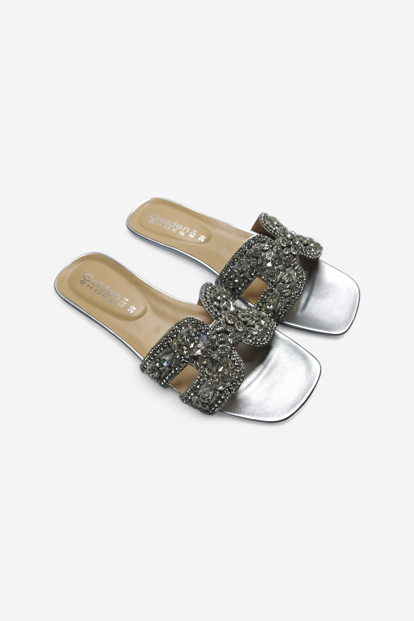 Look: A highly glamorous, open-toe flat slide with a modern square toe. The wide, distinctive H-shaped strap is completely covered in large, brilliant clear crystals, making a luxurious, bold, and dazzling statement.