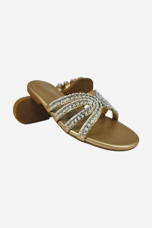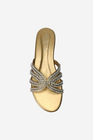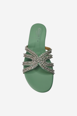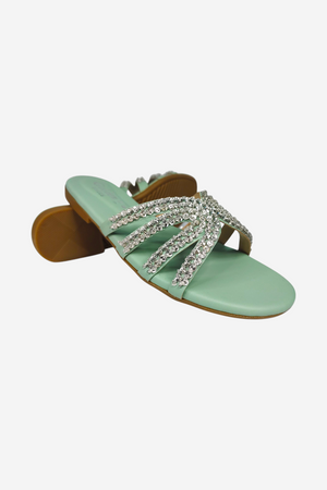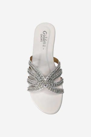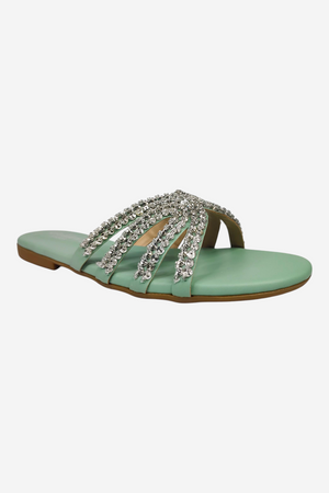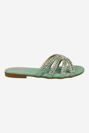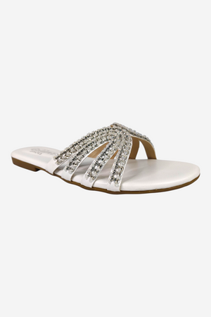Look: An elegant, open-toe flat slide sandal. The multiple, thin straps are covered in sparkling silver rhinestones and criss-cross beautifully over the foot, providing a glamorous yet relaxed look.