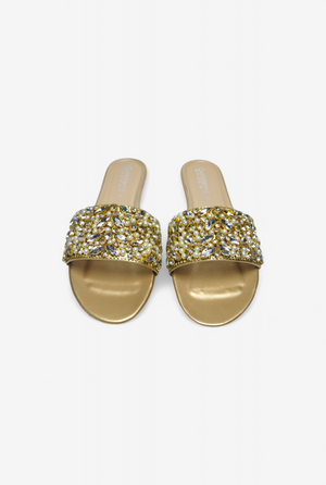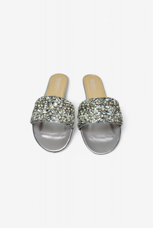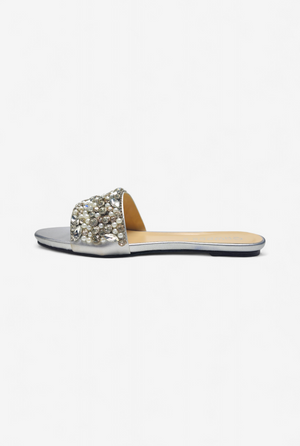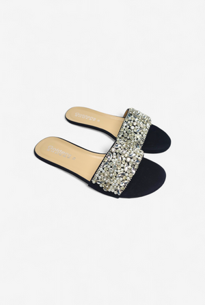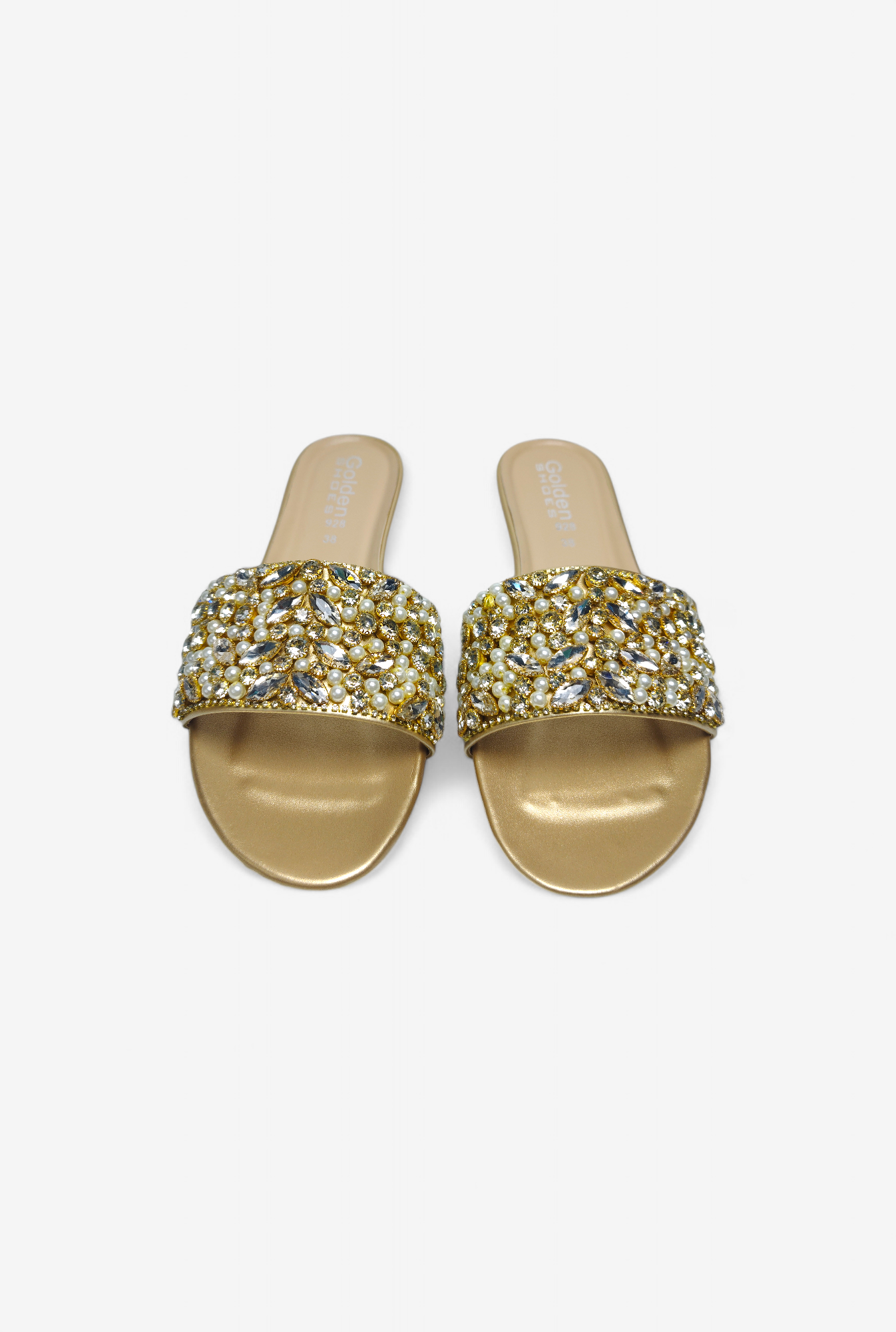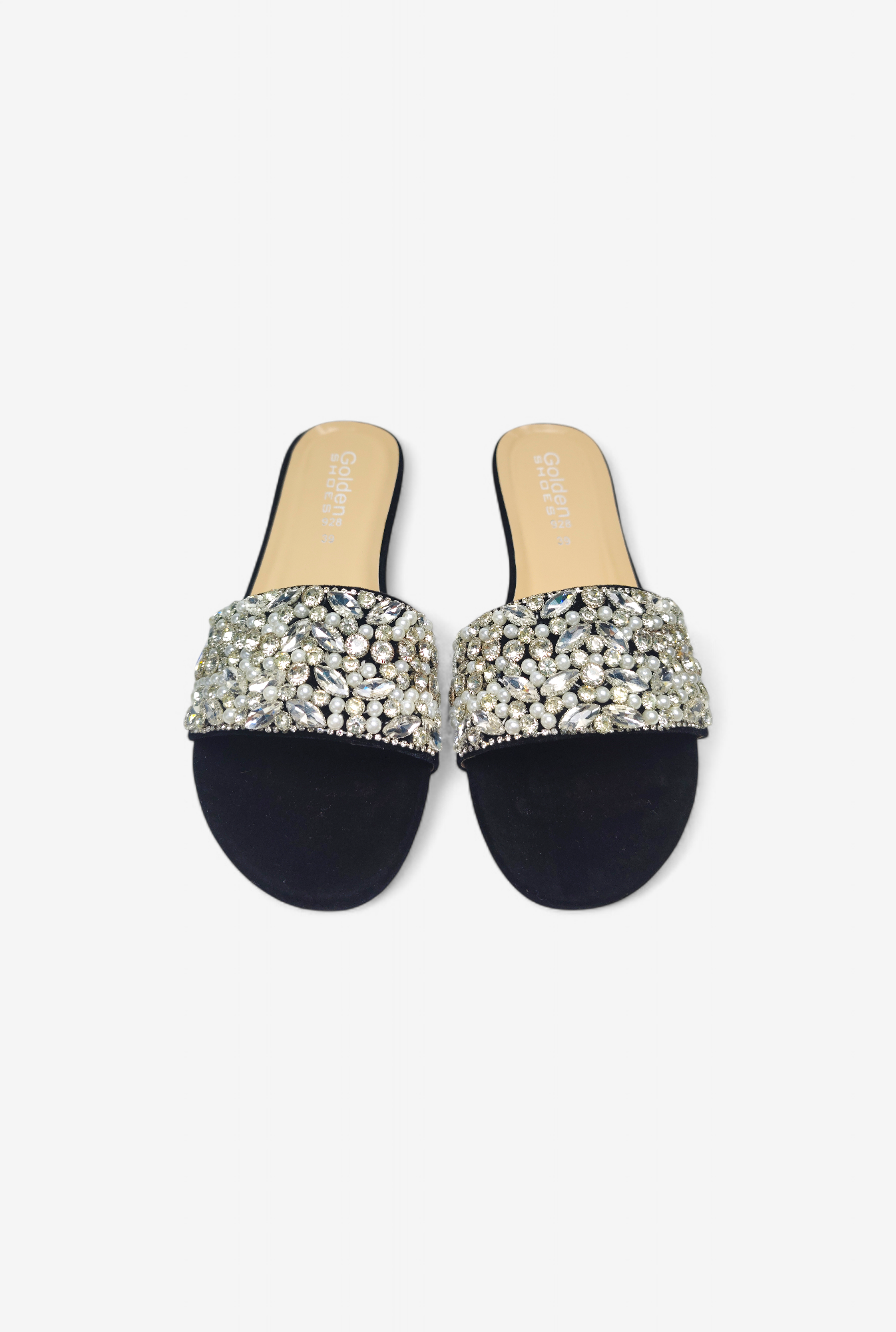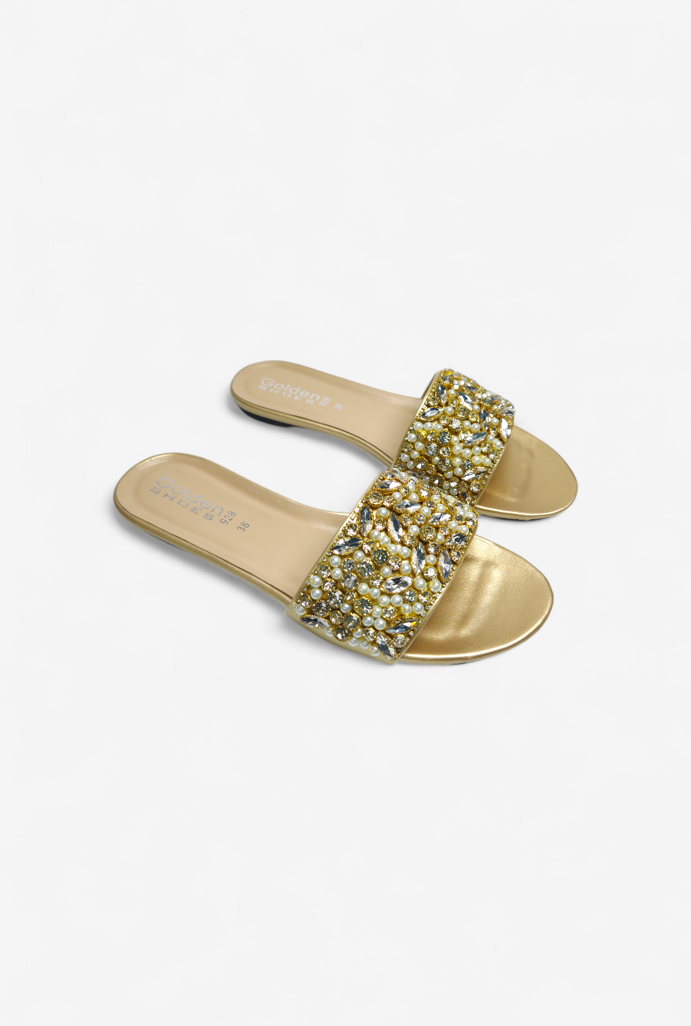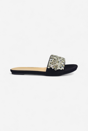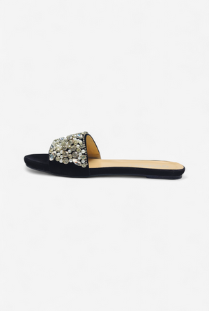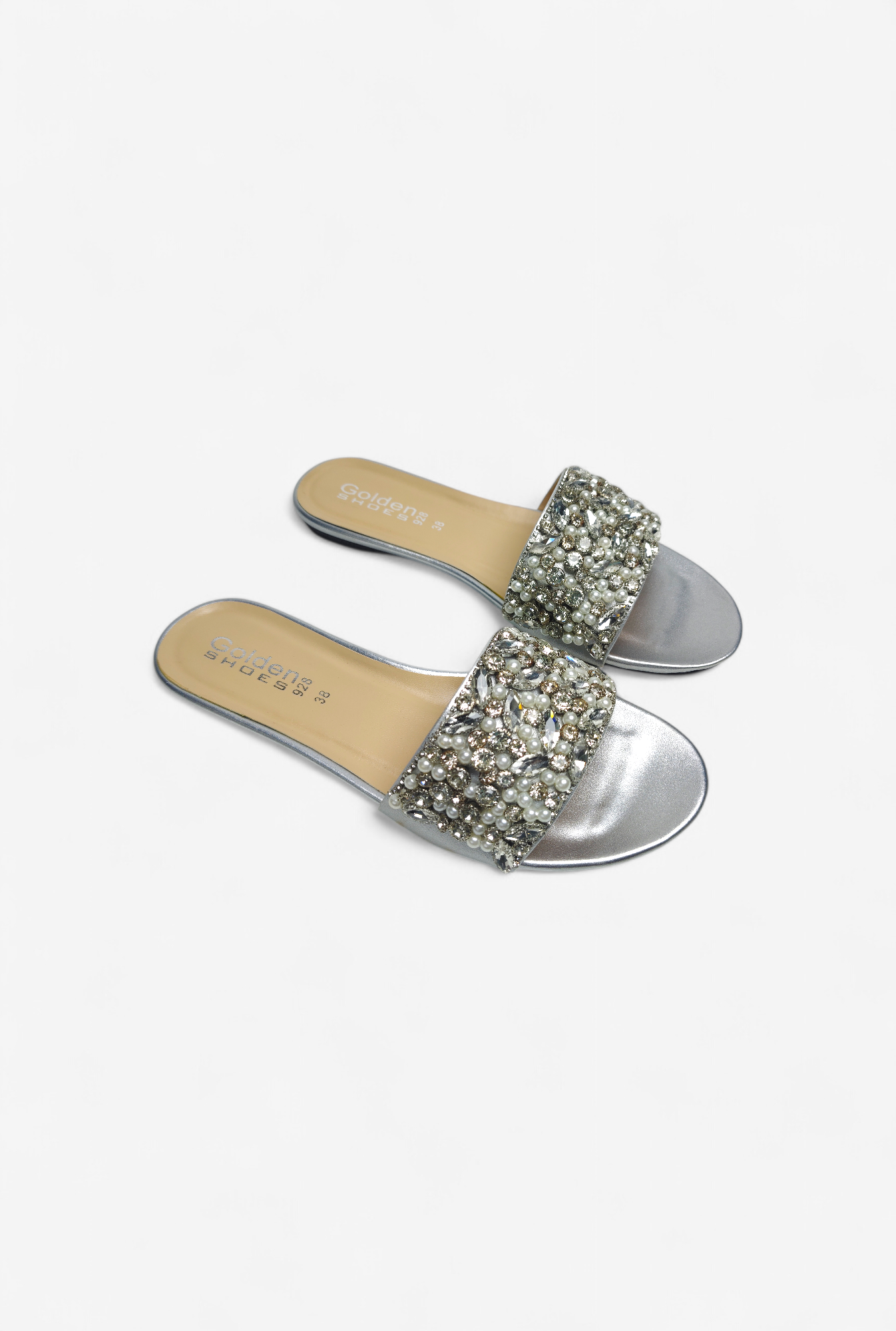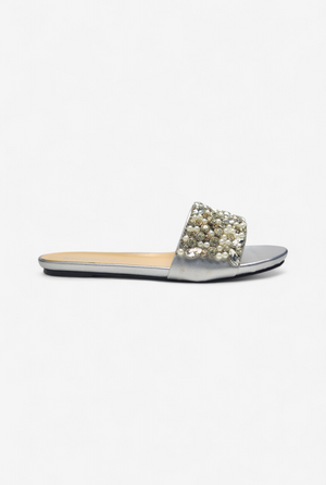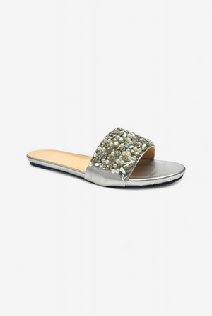 Look: A highly luxurious and elegant open-toe flat slide. The wide strap is densely covered with a lavish mix of luminous pearls and multi-shaped clear crystals, creating a rich, textured, and sophisticated sparkle.