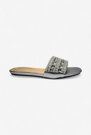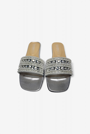 • Look: Luxury flat slide; wide strap featuring alternating rows of white pearls and large clear crystals.