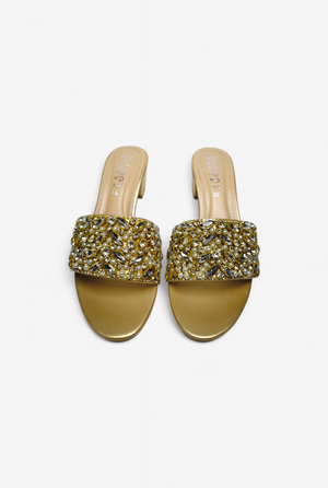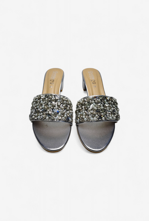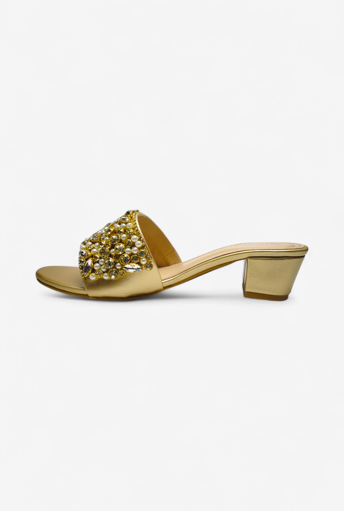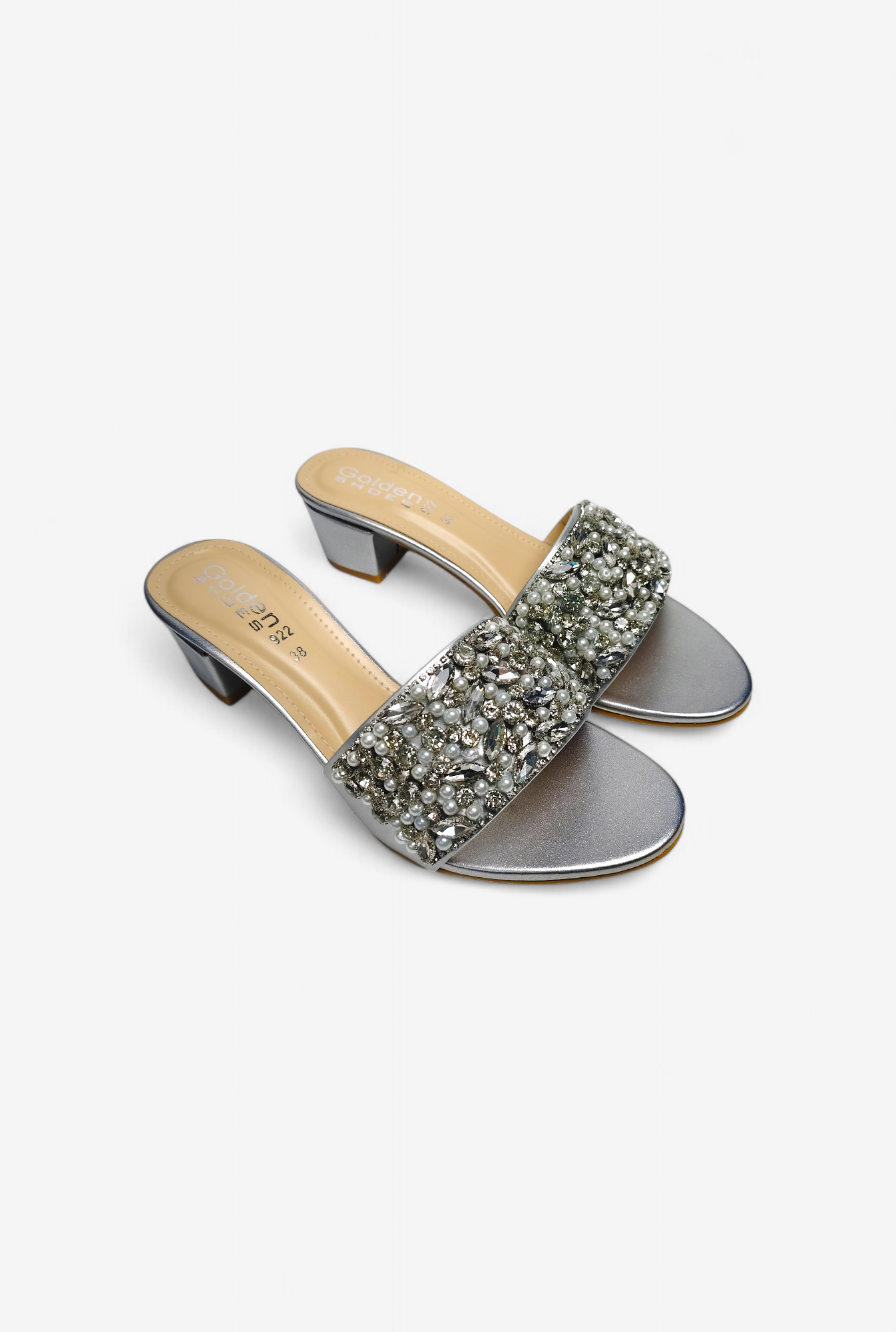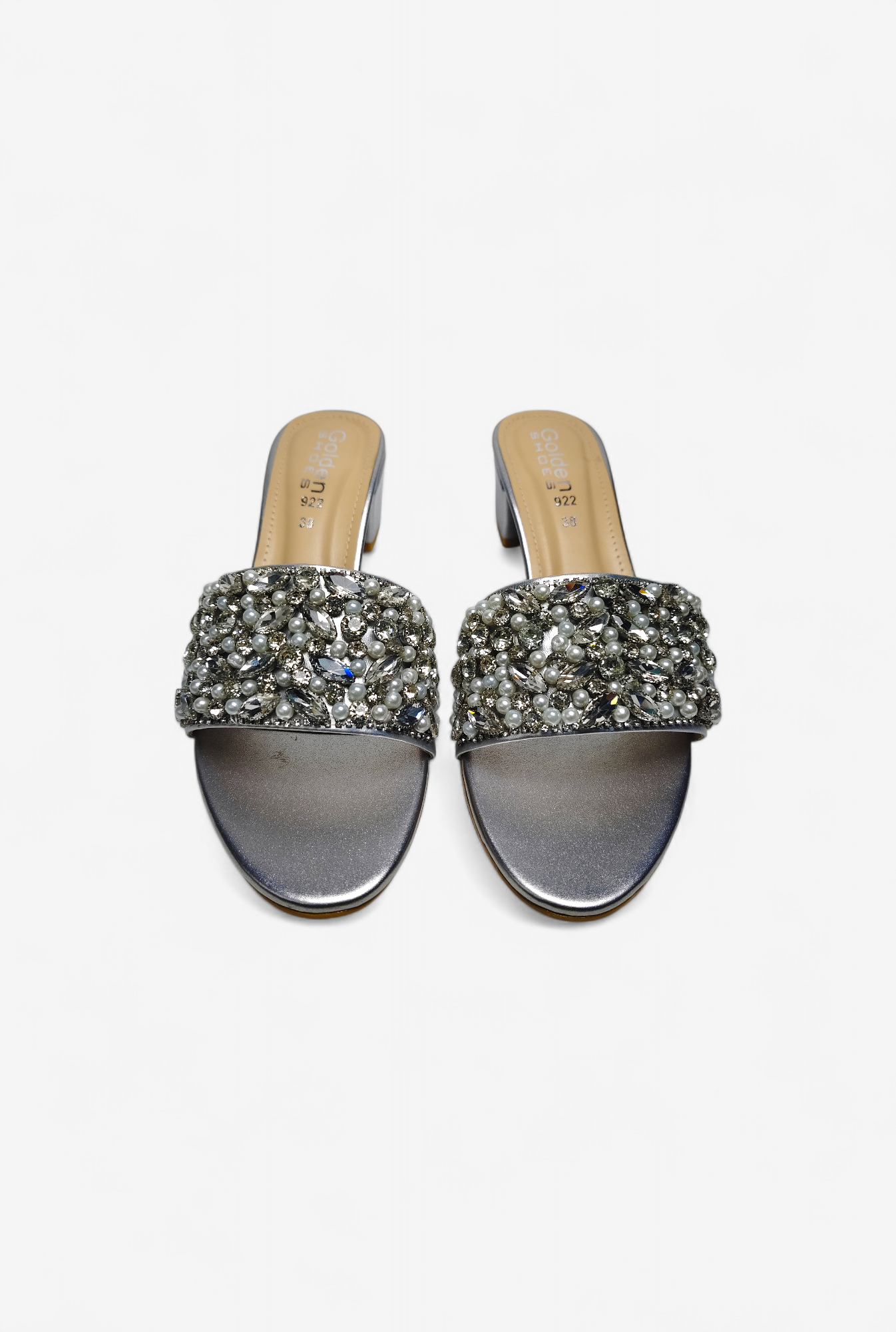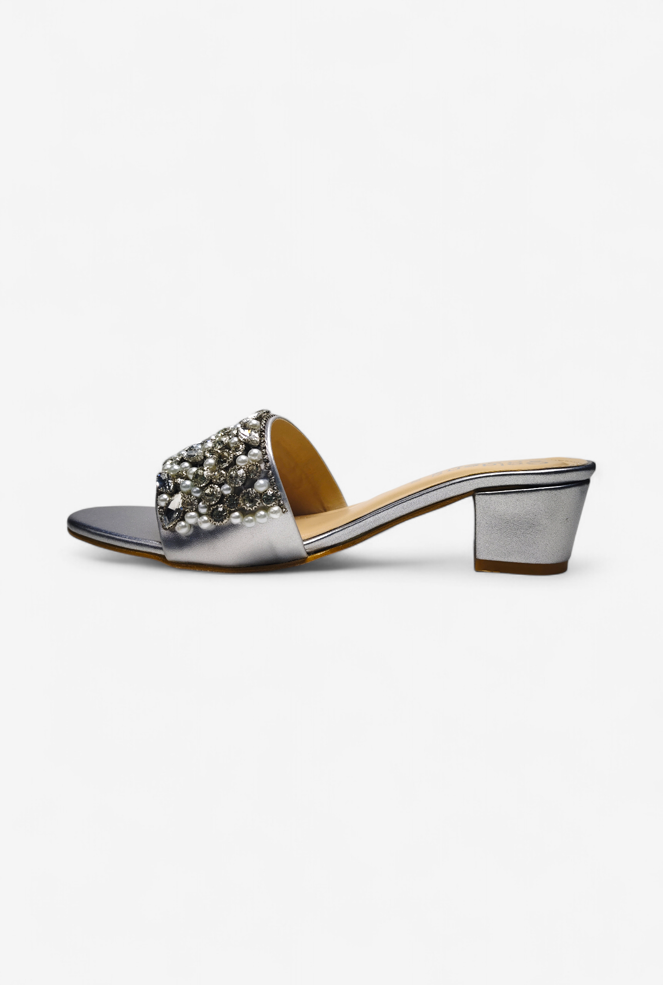 • Look: Luxury open-toe slide wide strap densely encrusted with white pearls and clear crystals.