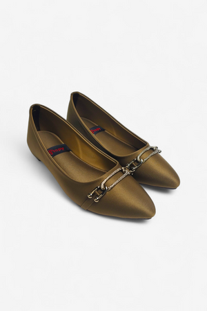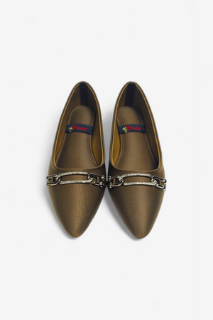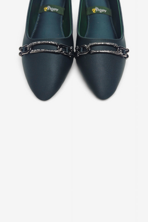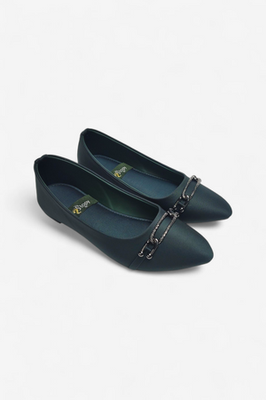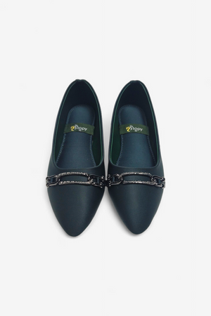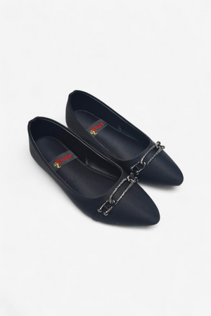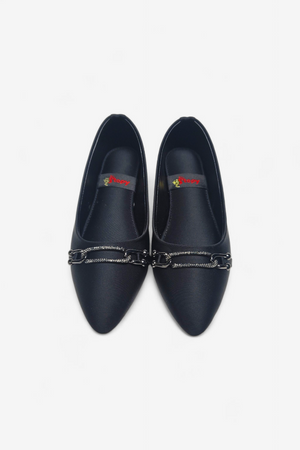 This flat redefines everyday polish, featuring a sharp, minimalist pointed-toe silhouette crafted from a durable, finely textured material. Its defining feature is a subtle metallic strap across the vamp, accented with a sleek silver-tone bit and delicate chain link for architectural interest. This is the definitive shoe for the modern professional, blending sophisticated detail with comfortable, all-day wearability.