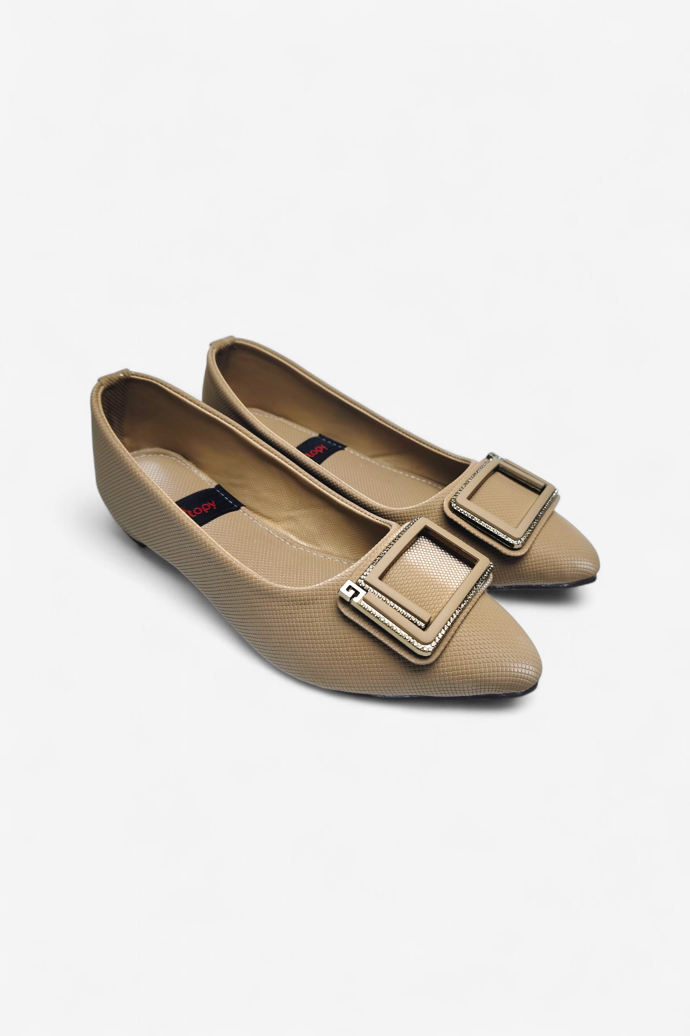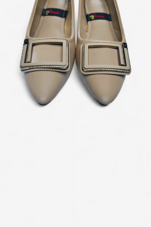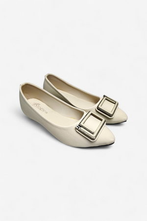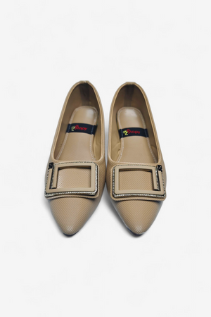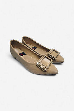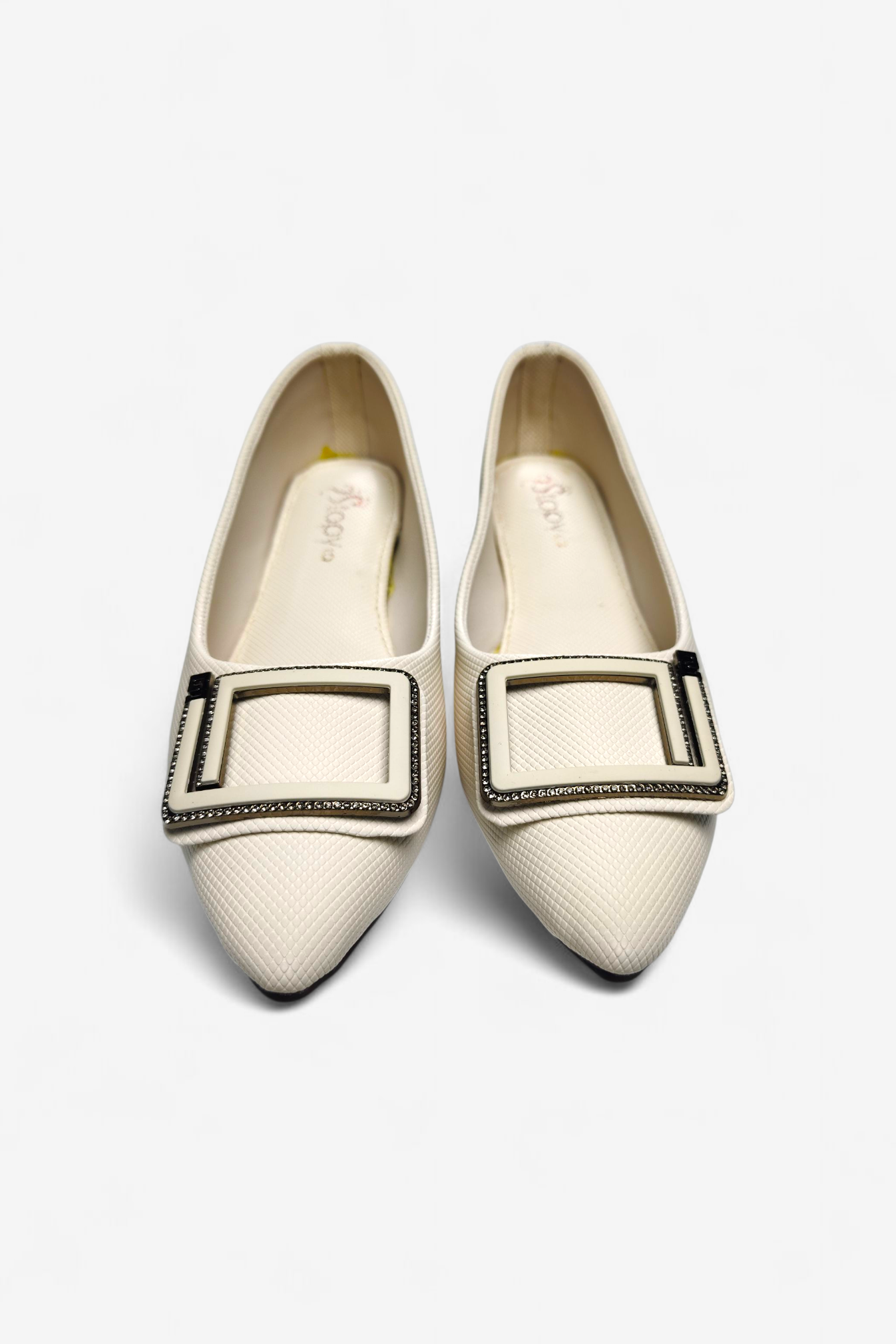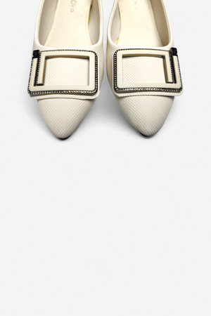This flat redefines everyday sophistication, featuring a sharp silhouette crafted from a refined, subtly embossed material. Its defining feature is a bold, architectural buckle at the vamp, composed of layered metallic and textured elements for a striking focal point. This is the definitive shoe for the modern professional, seamlessly blending polished design with comfortable, stable wearability.